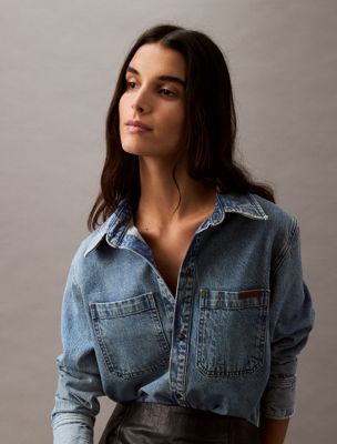 Par Calvin Klein Studio, en partenariat avec Cone Denim. Des silhouettes emblématiques en coton haut de gamme. La chemise à col boutonné profilée en denim lourd.